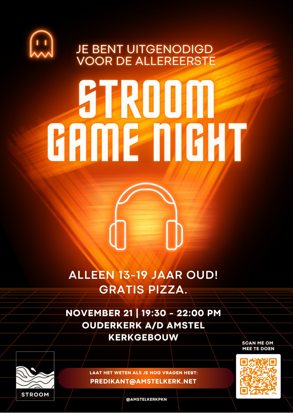 Meer informatie over de Game Night en de mogelijkheid om aan te melden is te vinden via de QR-code op de flyer of via contact met dominee Wynand Breytenbach via predikant@amstelkerk.net .